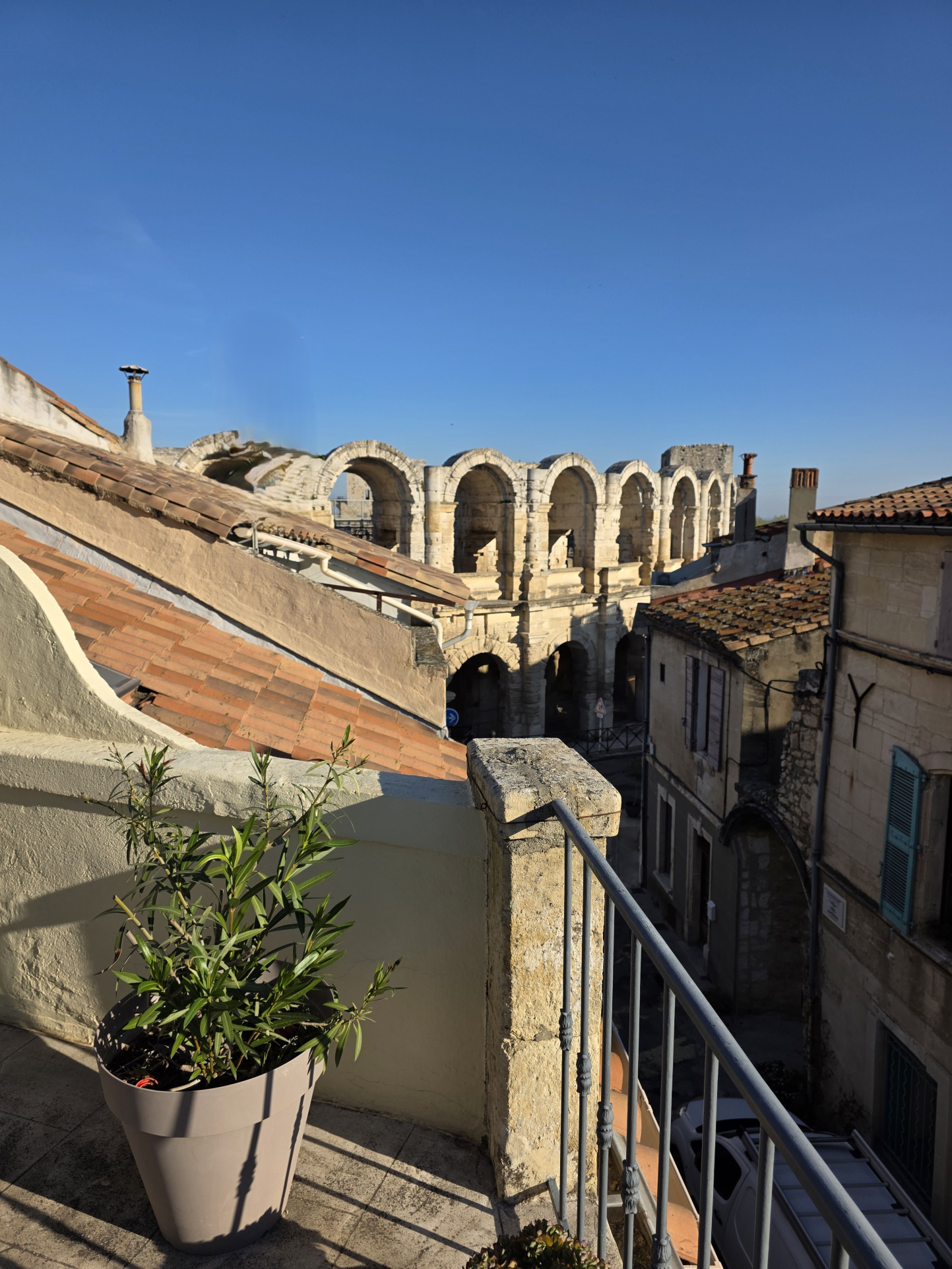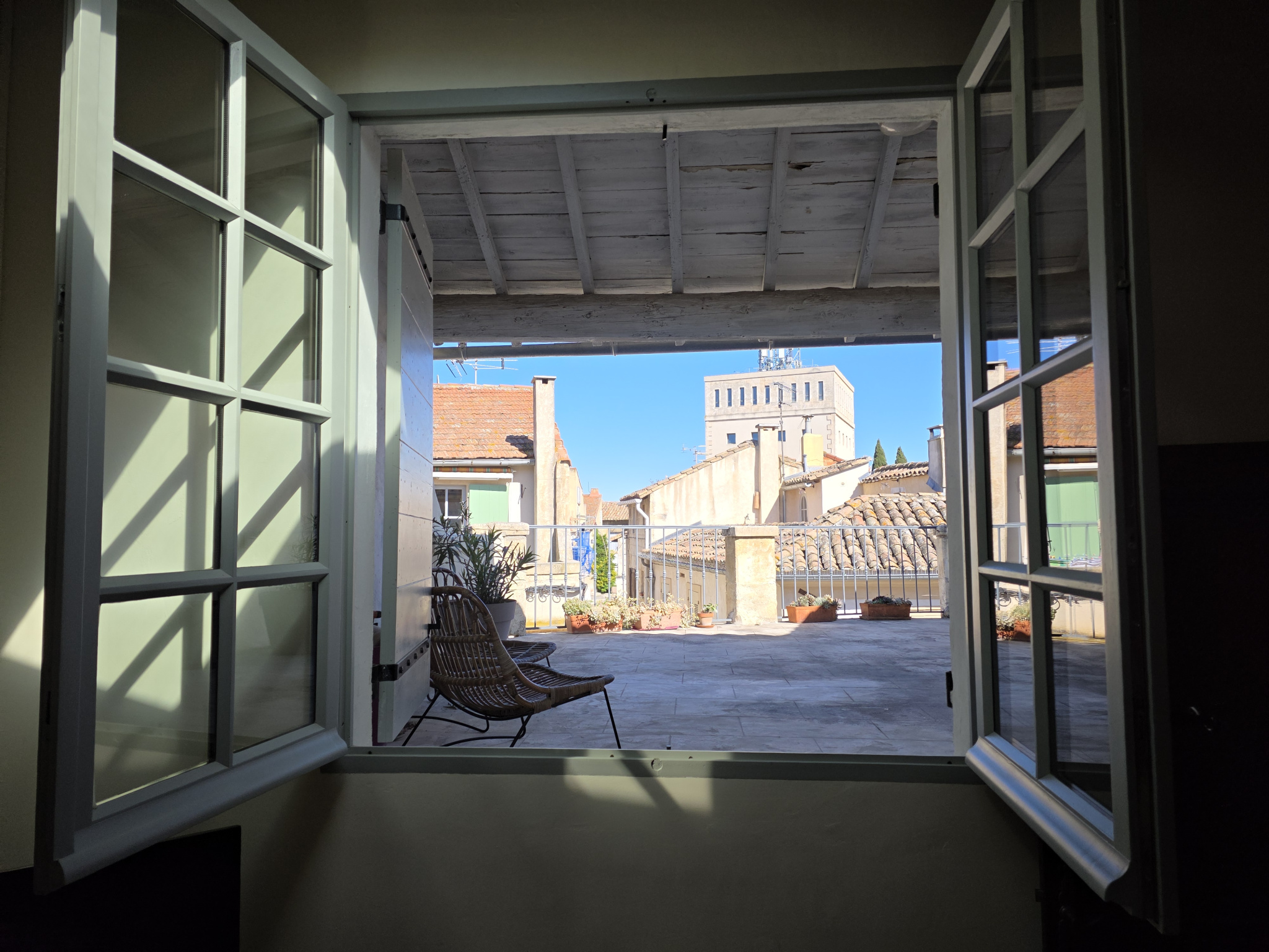 À l’extérieur, je dévoile l’un de mes plus beaux atouts : une superbe terrasse d’environ 25 m². Un espace unique, offrant une vue imprenable sur les toits d’Arles et ses arènes.