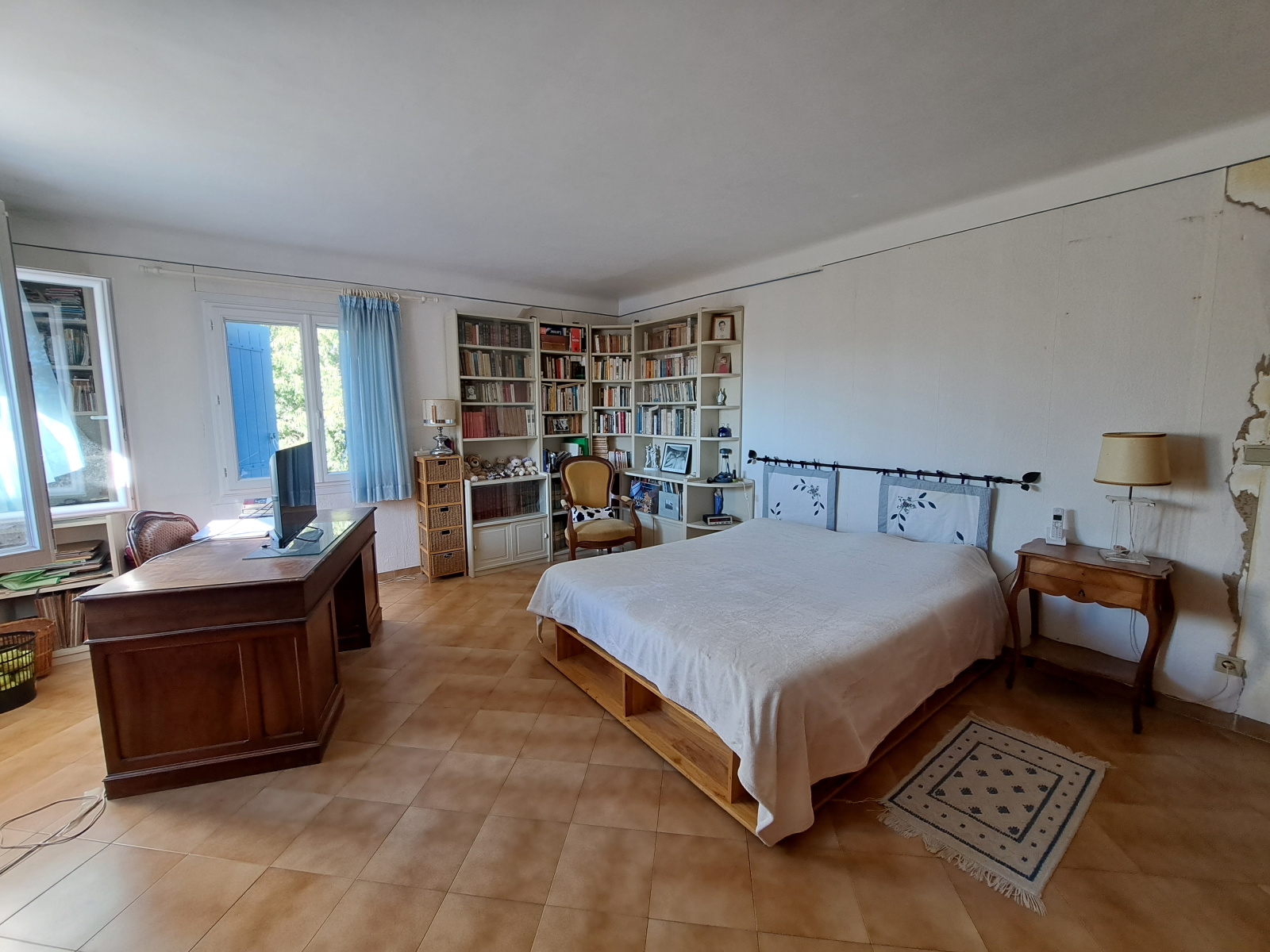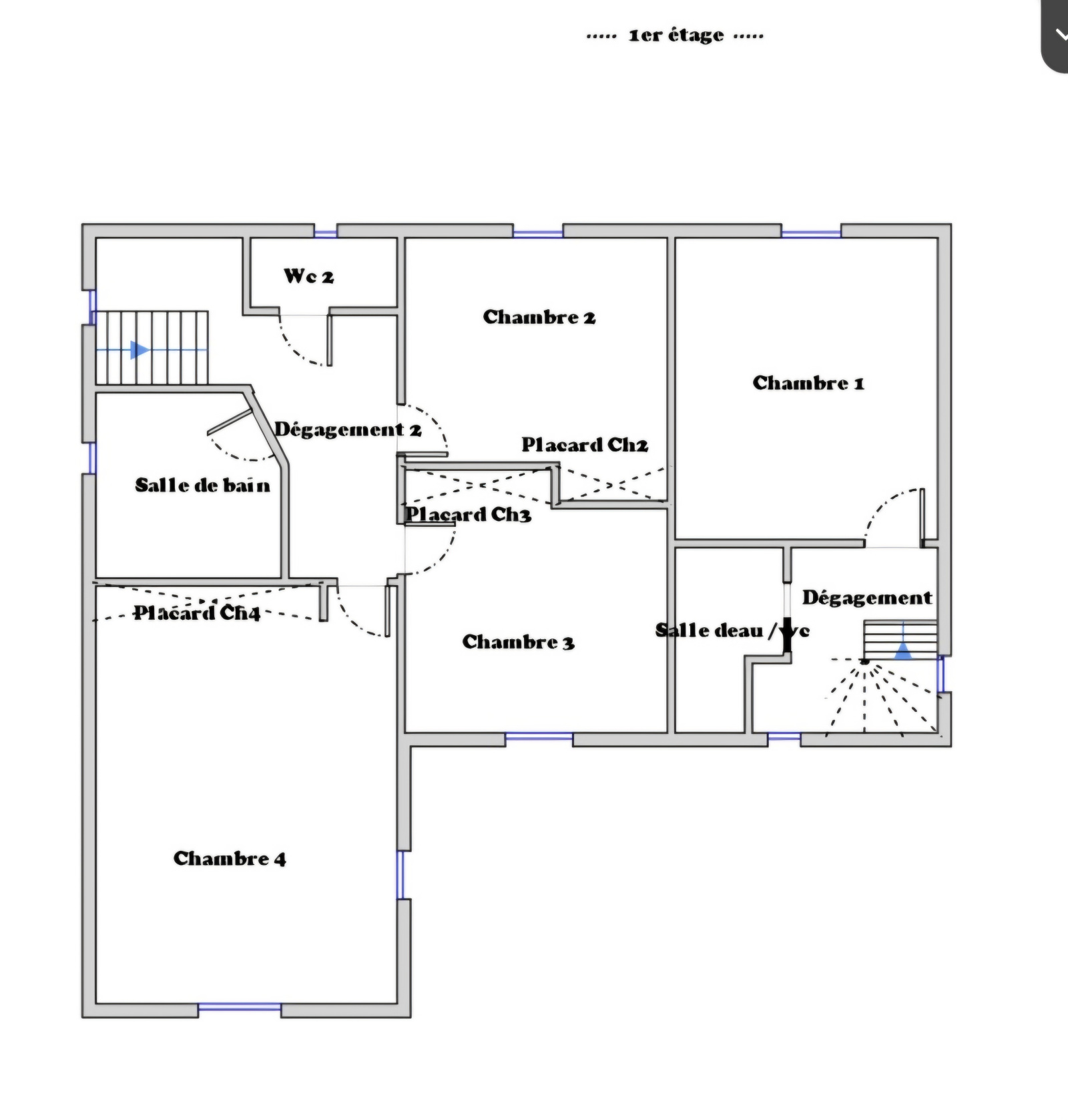 Mon étage est organisé en deux volumes, chacun distribué par un escalier indépendant. Vous y trouverez quatre chambres, une salle d'eau, une salle de bain et deux WC.